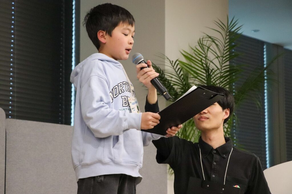 話す際にどもりがあるという生徒さん。保護者様は「発表を通じて、人と話す楽しさを実感してほしい」と入会を決めたそうです。この日の堂々とした姿に、思わず目頭が熱くなったとのこと。