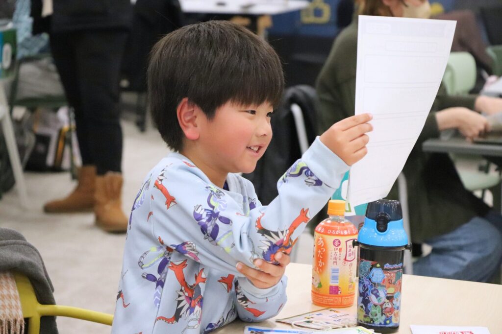 最初は緊張していた子も、自分の作品の話になると目がキラキラ。 「ここ見て!」「ここが難しかったんだよ!」と、恥ずかしがりながらも伝える様子が印象的でした。